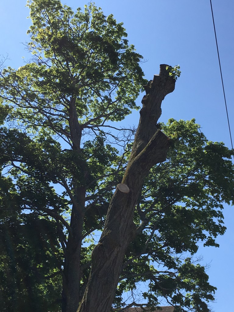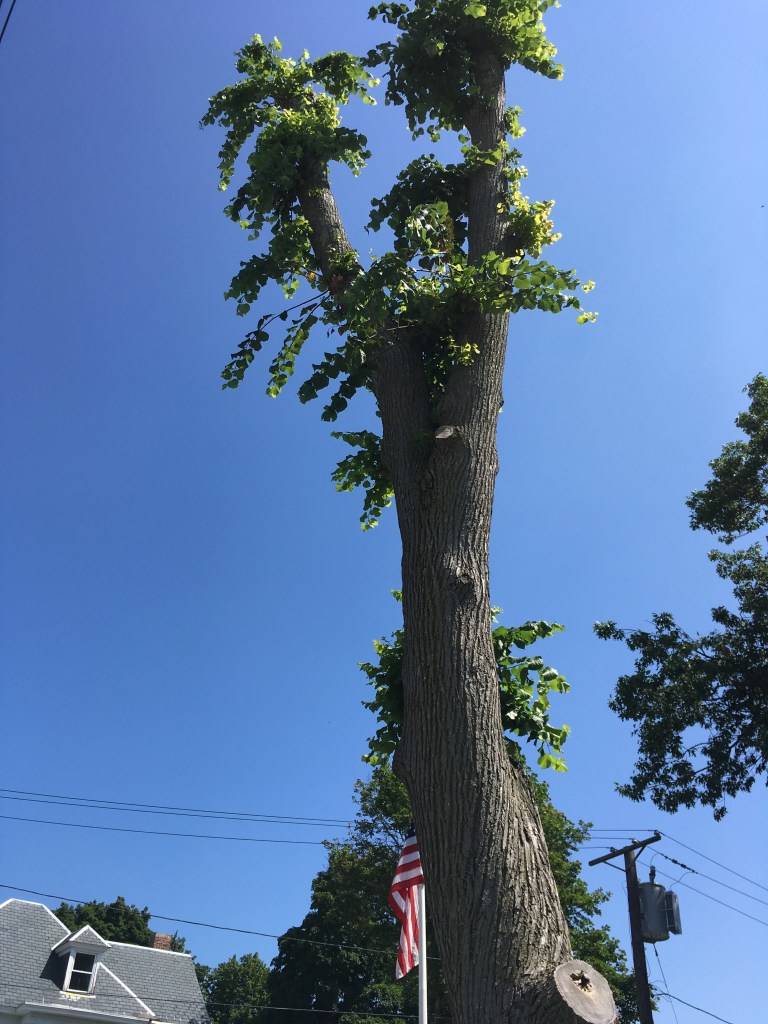First linden, in 2019, trimmed, defiantly regrowing, soon to be removed
