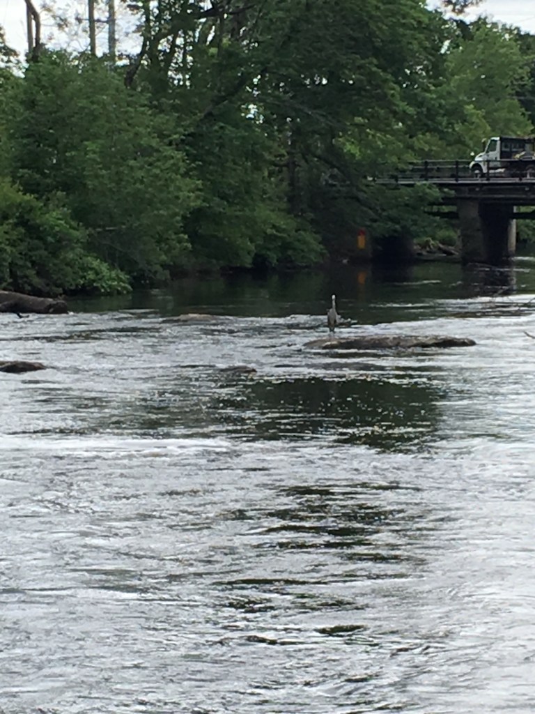 But then it cooled a bit, and then last night it poured, and I am happy, because my vegetables (abundant arugula!! healthy looking mustard greens, tomato plants, eggplant, cilantro, basil, sage… may they all continue and thrive. May we all as well) needed the water, as did the Concord River on whose side I stand in the photograph above. I am standing at the top of the fish ladder in this photograph. In the distance may be the great blue heron, but maybe this one of the moments when he was elsewhere. He did spend a good deal of time with me during the final week I herring watched. I mean, it’s in his interest to do so. Herrings<->herons. Food!!