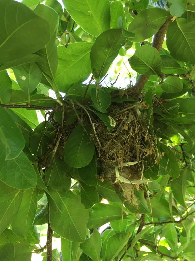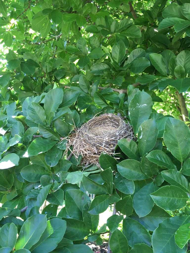 A bicyclist just pedaled by, a balding man on a pale blue city bike. A Carolina Wren just sang while perched out front on the elbow of my weeping birch. Haydn’s Surprise Symphony just came to a close on my radio/CD player/MP3 player. The Rose of Sharon tree outside my west window, half dead, is also half alive and blooming hundreds, thousands of while roses of sharon with rosered centers. The bees are visiting them. A card sporting a painting of a cottage on the island of Vinalhaven, Maine by Mildred Moss Cheney (1910-2002) sent to me by my friend Jane is tacked for my viewing pleasure to the crossbar on my desk lamp.