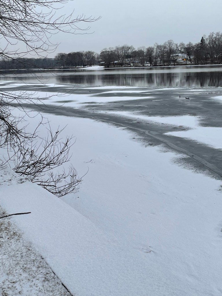 I am pretty sure I am in a better mood than when I wrote and posted my blog last time, which was last year now. I sit before my window watching the snow start again this early afternoon. Six hours almost to the minute that I watched it start this morning. At that time my phone weather app assured me that it was cloudy out and a “wintry mix” was not to begin until noon. That early morning snow lasted half an hour and left a good, solid, slippery dusting. I trod through it around mid-morning from my house to the river. Such a wonderful river. It flowed on this day silently, slowly. It carries a skim of ice along the edges, and no visible debris–always a gift from a river that traverses this city and many others along its not inconsiderable length from source to sea.