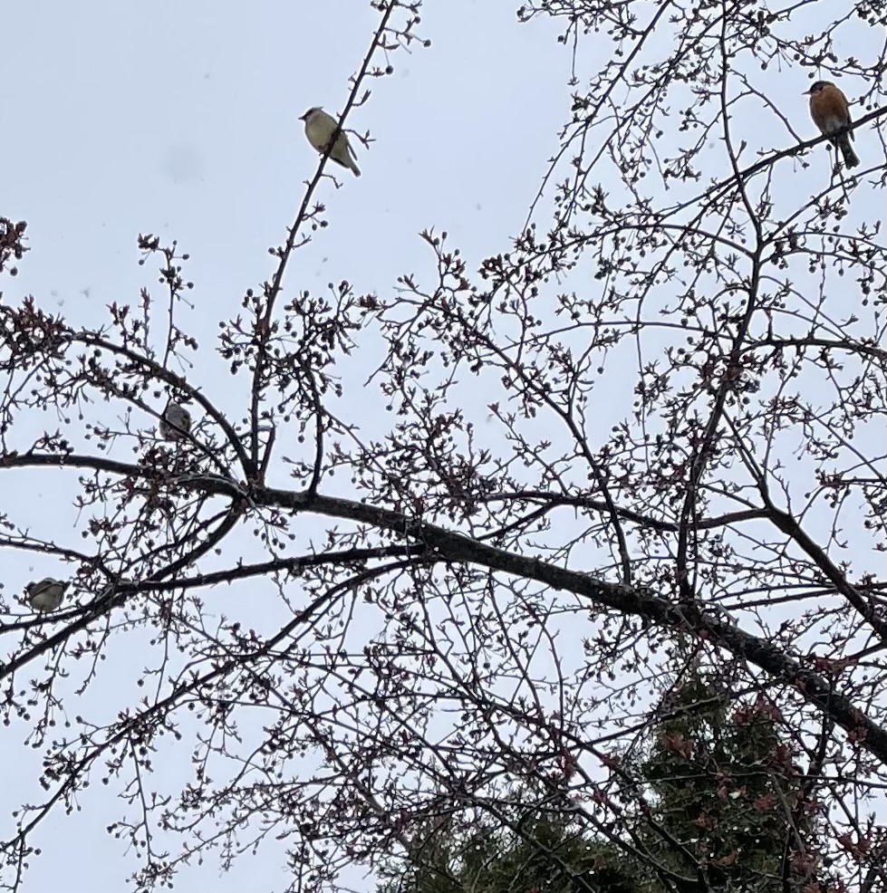 I have not accumulated a fistful of photographs from among which to share with you. I have not identified an earful of rerising, and passing-through bird songs to report. Well, a most prominent white throated sparrow seems to have audibly supplanted the mockingbird this week. I have seen a carolina wren, but this one seems to not want to rule, and silently clutches a branch swaying as it hangs from high in the weeping birch out front. And the robins are very present this year.