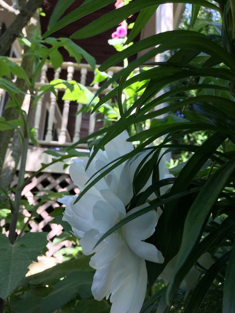 This is the time in each year when the unrelieved heat suddenly is relieved, at least once or twice, and more often during the night. This is the time, I note, when those who use air conditioners in their homes comment, Oh, I turned the air conditioner off last night. This is the time when I pull the blanket back over my shoulder. If my husband had his druthers, the first floor of our house would have been far less heavy in the air. But he gives in to me on this, and the sole air conditioner is upstairs in his room/studio. My room here on the first floor, southwest corner shaded by the weeping English birches, relies on cross breezes — as does every room on the first floor; every window on the first floor of the house is open, that is the summer modus operandus. I do not like air conditioning. When we are in the livingroom, he has a fan close at hand, and a hand towel to mop sweat, and sometimes a damp washcloth to cool his neck. I think that’s pretty kind.
