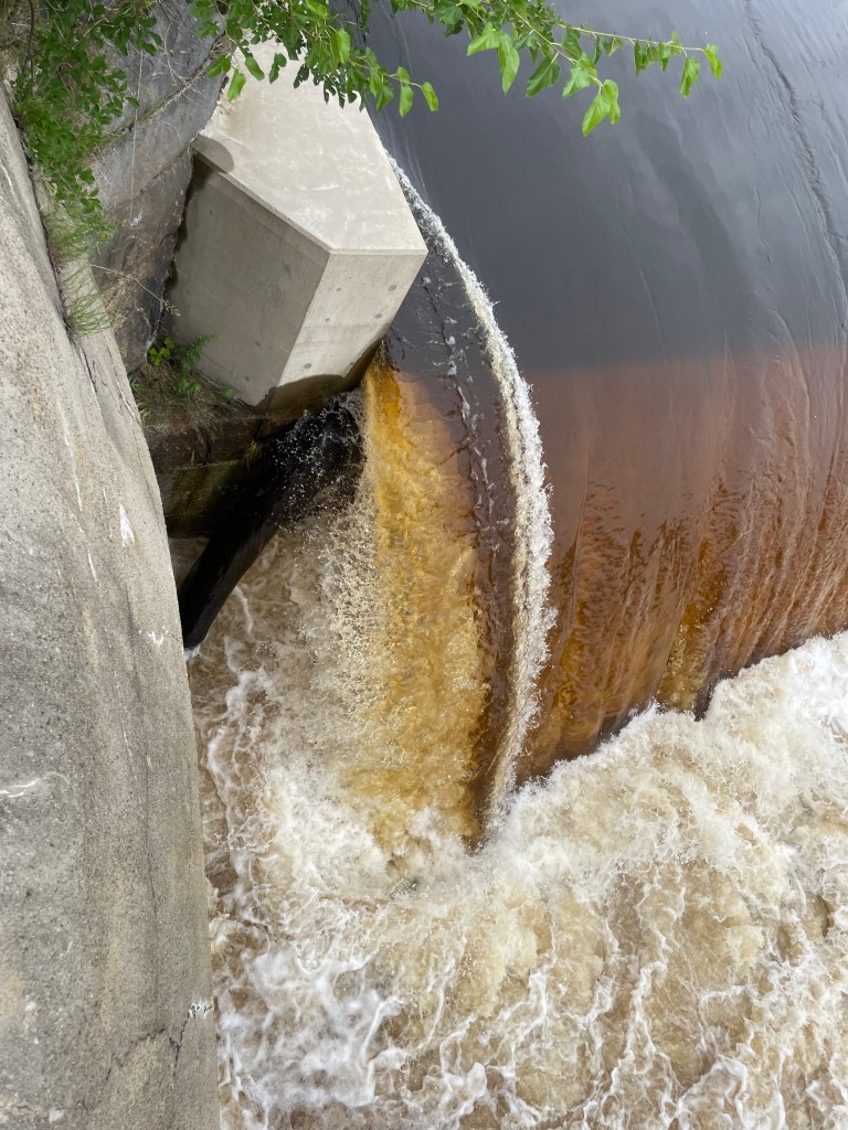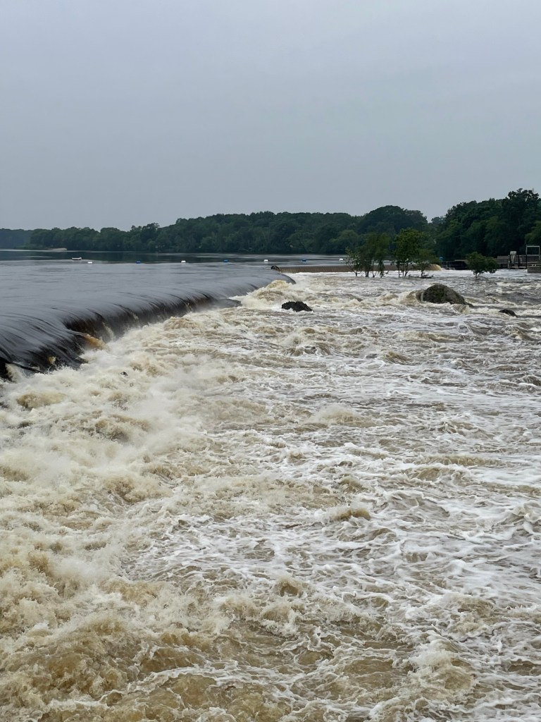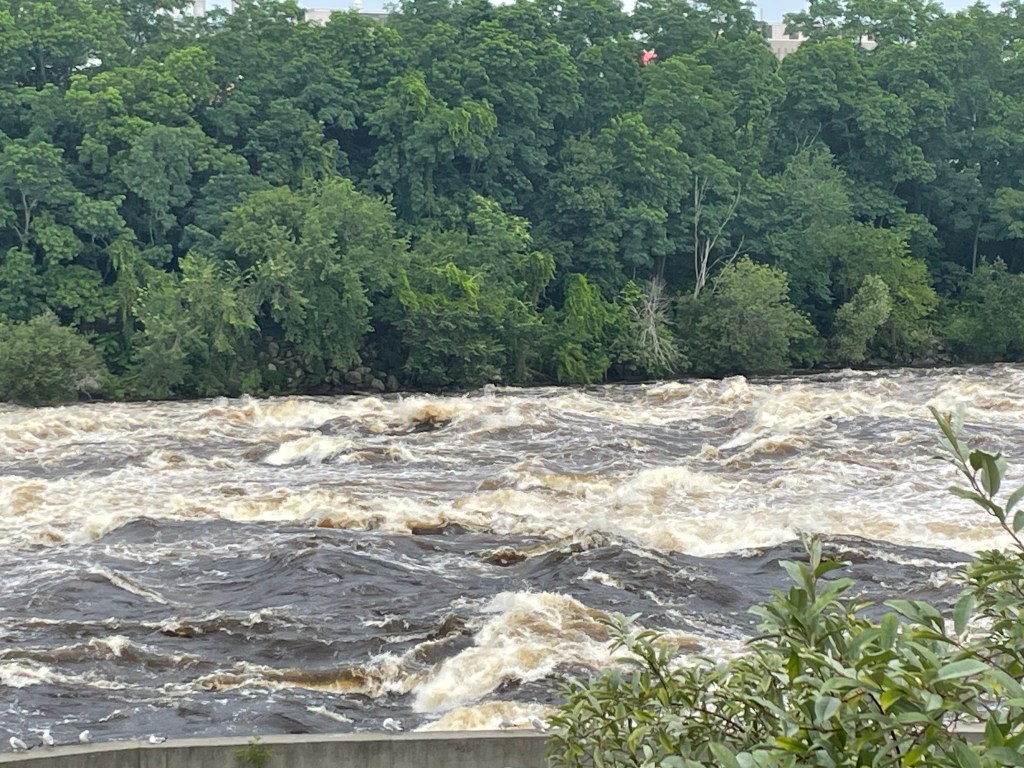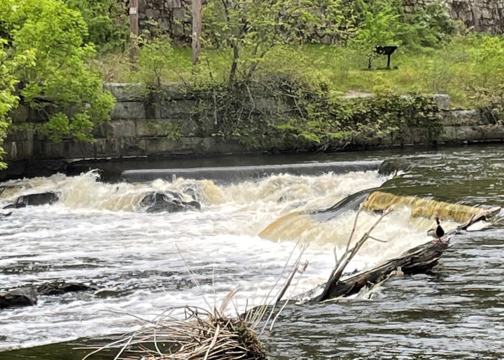 Pedaling along the Concord River, just before where it pours into the Merrimack River, at a point where it is sliced by a small island, which once was connected by bridge to the east bank, but now stands untrammeled except for one I-beam continuing the past of this place, I stopped to watch and hear the rushing of this river currently running very high along its banks. And I glimpsed someone else doing the same.