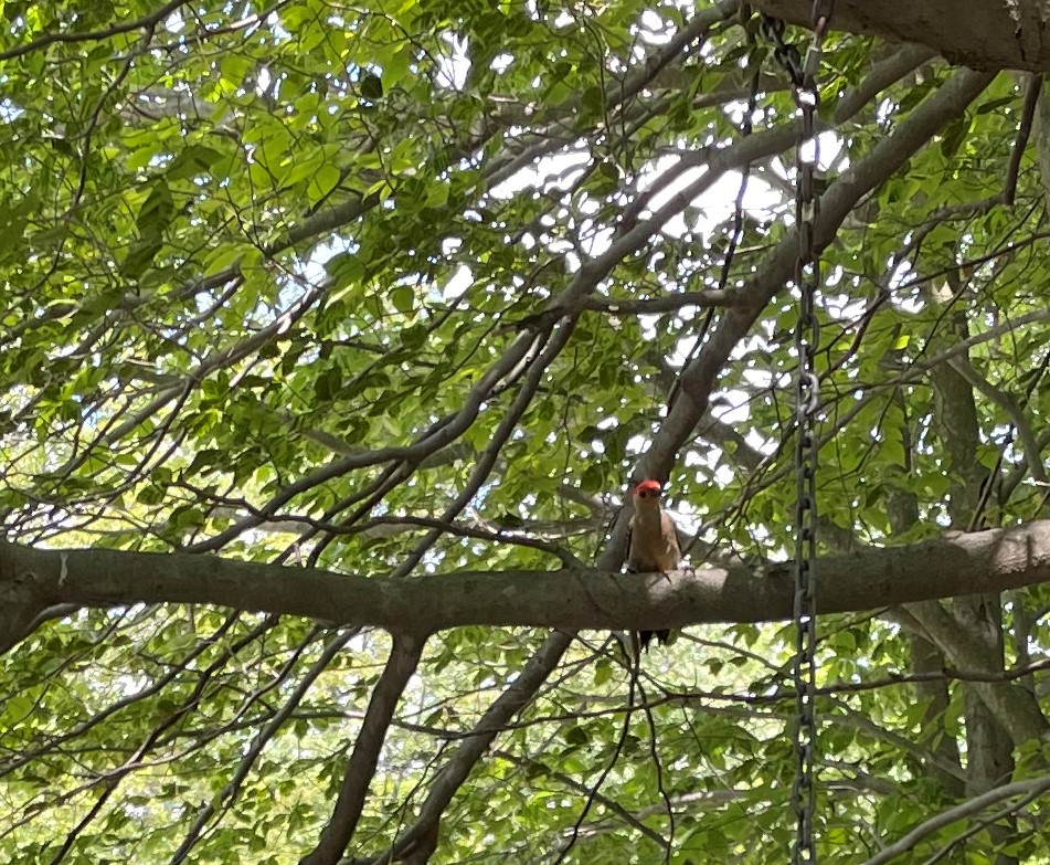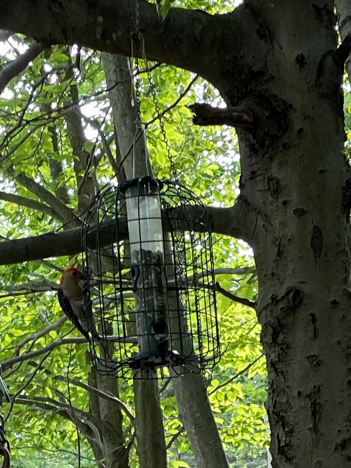 Here on the left is the dogwood tree, center back is the plum tree, porch plants are late cilantro, an amarylis sans flower, a calla lily just hanging on, and the horse chestnut tree, that now is planted near the shed. But, peer hard under the dogwood, just about level with the back window of the house across the fence, if you can figure it out, you will see a nuthatch flying away from the feeders. His wings are open and elevated. He is flying toward the tree trunk, behind him is the plum tree, and he might look to you like one of the leaves of the mulberry bush that is flush with the fence there. Actually, here, I have expanded that section of the photograph.