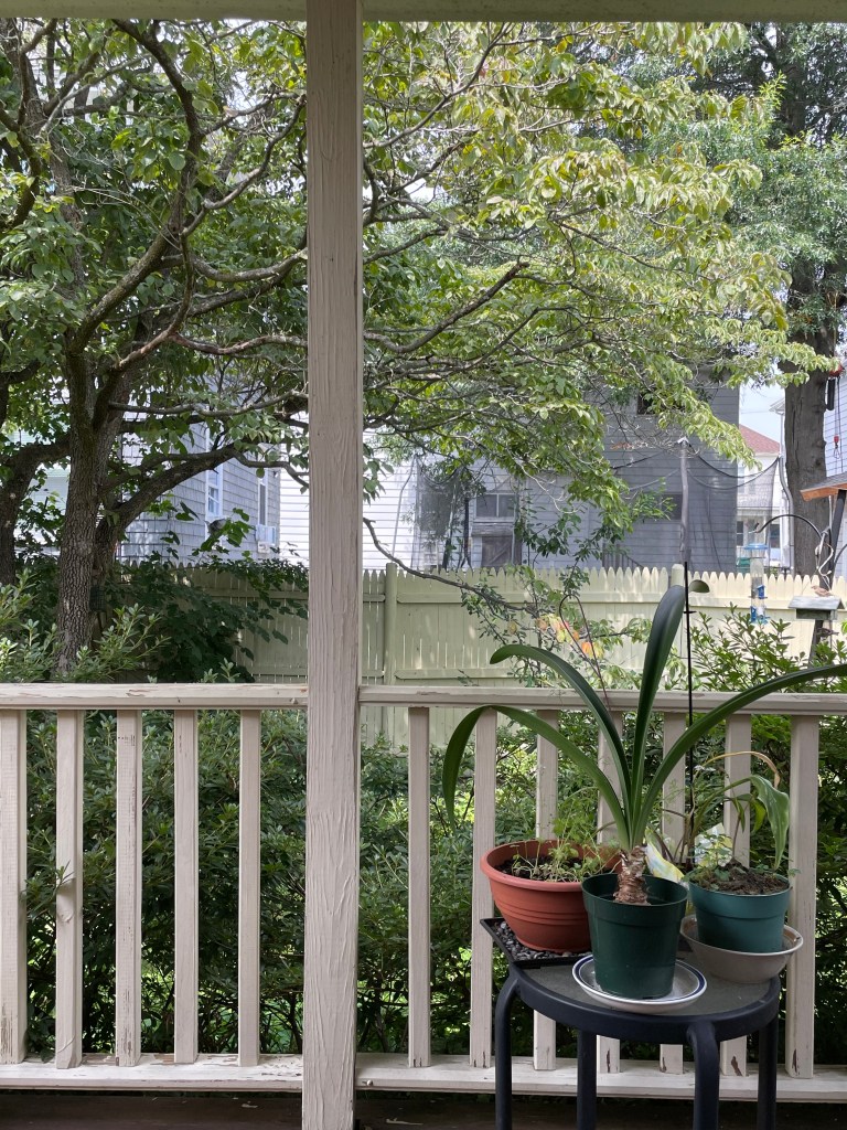 Then just outside the westside kitchen window is a plant I bought several years ago at the Garden in the Woods in Framingham, Massachusetts. If ever you have the chance to visit there, do. It is unique and it is beautiful. The plant’s name I cannot remember, but its appeal to me was the fact that when it rains its pale green, scalloped leaves, resting horizontally beside each other, and slightly overlapping one another, hold rain drops aloft, like a table of dew drops, but it’s rain. Perhaps someone can tell me what this plant is?