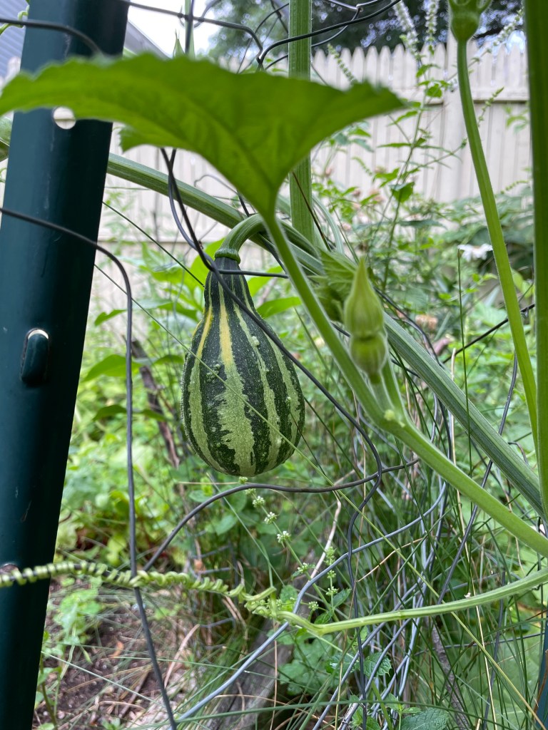 But can we live locally anymore? Many, many of my fellow townspeople in our 110,000 population, magnificently diverse city do manage to raise admirable summer vegetable gardens in tiny plots owned, rented, borrowed, or purloined by them. I have even consumed from my own garden abundant arugula, some tomatoes, some cucumbers, some beets. But other than vegetables, what else? What else in anyone’s life these days can be provided, produced at one’s homestead or close neighborhood? By the way, the hoped for buttercup squash I wrote about last time was not. It is gourds. Perhaps one of you can use them to decorate? I am at a loss for what to do once I tire of seeing them draped colorfully over the fence, stakes, and other obstacles that they in their persistent crawl forward latch onto.