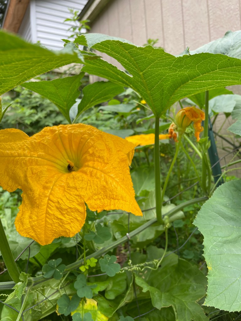 I am growing a rather august vine in my backyard this year, it has enormous leaves, enormous flowers, the non-fruit bearing ones of which I include in my backyard sourced salad and they are succulent! It has been growing and stretching and attaching by tentacles to all manner of grippable surface for a month, and until a couple of days ago, provided me only leaves, vine, flowers, tentacles, and great awe. But then fruit began to grow!! A squash, I think a cucurbita maxima, based on the leaves and flower. If that is so, that means it is a buttercup squash, and it and butternut squash are my favorite!! Here are two photos, one including the first fruit of note. What do you think?