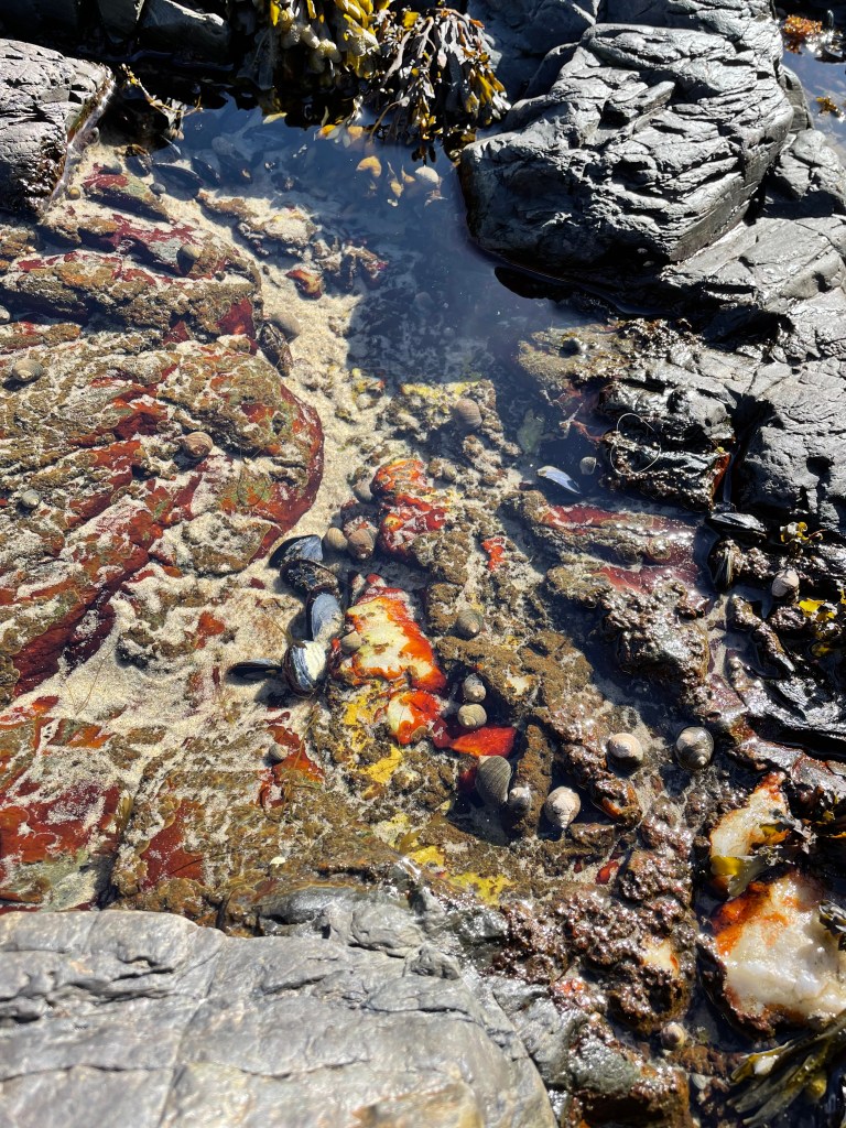 Perhaps you can tell, perhaps not–the various mollusks are underwater. I lucked out, and arrived at lowest tide. So they were in puddles, and I could be close. A couple of hours later and these would have been inaccessible to me and the hovering seagulls, until, of course, they became accessible again in the next cycle. This thought brought me to the thought of the cyclicality. Is there such a thing as a straight line in the created universe? So, two divergent thought streams flow out of my brain simultaneously: Is anything as it seems? And, is anything irredeemable?