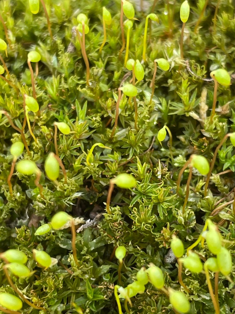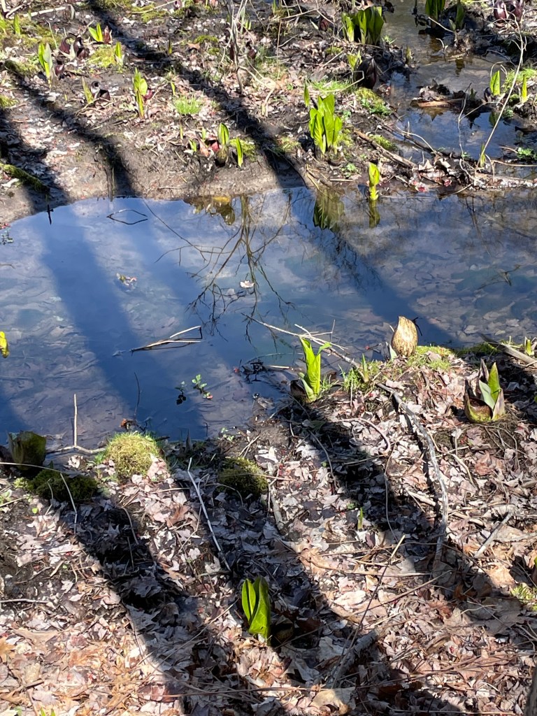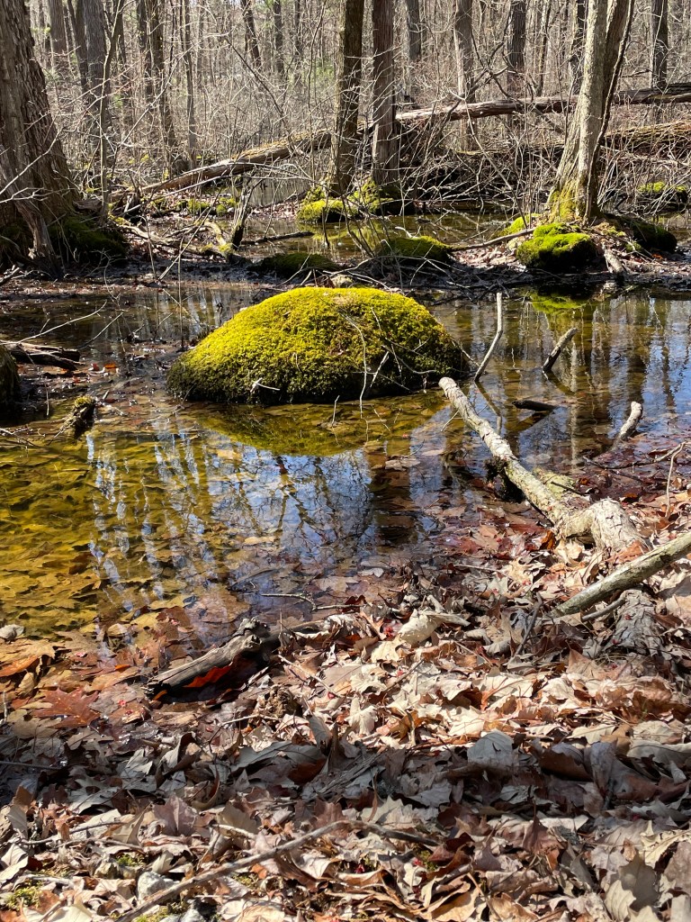 moss and seasonal ponding. Leaves, predominantly oak remain, most others having returned to dirt or other elements. I think of it as oak protects. Maple, ash, birch, aspen, beech…. provide.more moss and seasonal ponding (hmm, seasonal? after I just redefined/shortened the duration of its meaning? Perhaps, day to day ponding)and amid the leaves in this site, skunk cabbage is emerging; it promises and it deliversand delivers, and delivers! No stink yet, only one bract of not green in this photograph, but stink it will come!! It’s the smell of life, and then they wither and shrink back to dirt.this very pretty, tiny green patch is cord moss; it is known also as water moss; a wet dirt dweller.