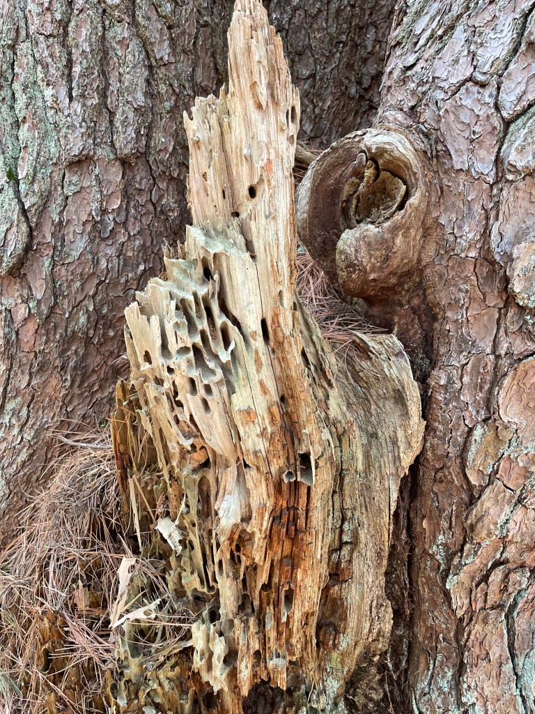 And, not wandering so far from home, pedaling here, in Massachusetts, pedaling beside Hondas, Mercedes, Hyundais, Nissans, Mazdas, Fords, Rams and Jeeps, F150s and Tundras, turning off, leaving rubber-on-road rumblings and pedaling beside and under tall red oaks, red maples, cottonwoods, aspens, white and red pines, hemlocks, spruces, green ashes, white oaks, black oaks, yellow poplars, paper birches, grey birches, black birches, copper beeches. Dismounting and whisper stepping within pine woods, shushing through deciduous woods. Stopping and fingering mud and packed, sodden, not-yet-mud tree-fern-reed-shrub leaves; standing before a bird-shelter and feast riddled once thriving pine counting its ladder of holes, squatting before a long fallen oak to visit its four and six and eight legged residents, before a spider web and its captives. Discovering.