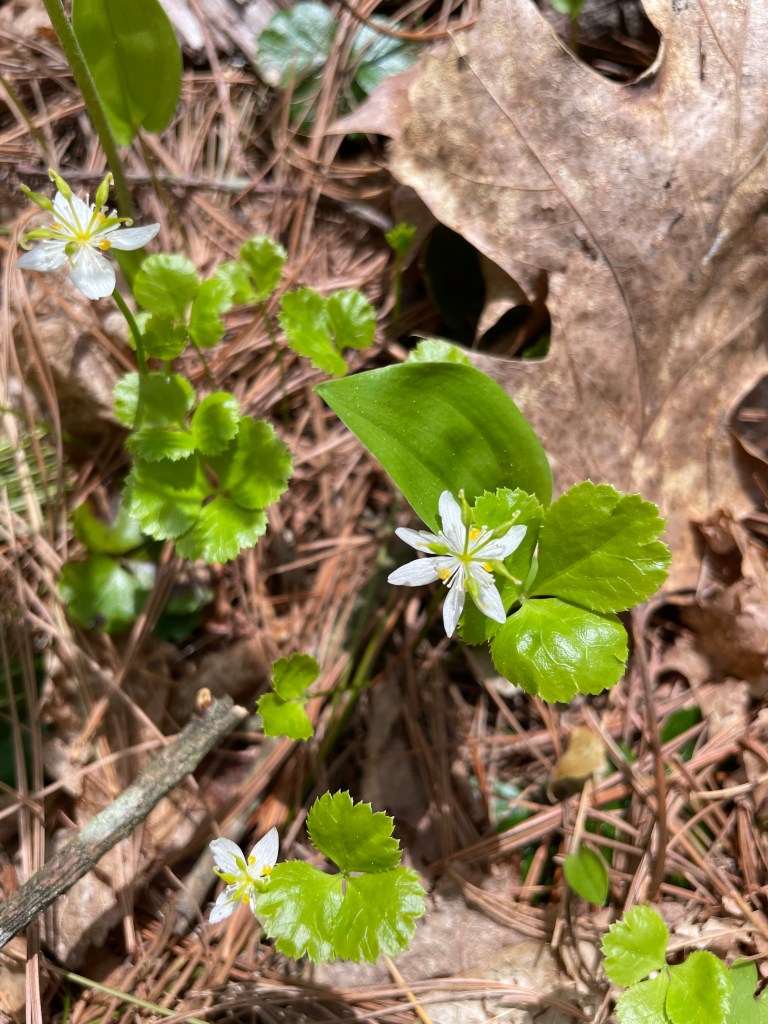 This, I read, is called an Interrupted Fern. It is so named to describe the gap in the middle of the blade left by the fertile portions after they wither and eventually fall off. (Well after this photograph was taken, which was April 29th)I’m showing you these tulips, which bloomed later than all my others. Nice of them. Just when I thought, oh well, no more spots of color, these popped out. A friend of mine gave me these last year in a pot, I planted them last fall, and voila!! Threeleaf Goldthread. According to wikipedia, its rhizome was chewed by indigenous peoples to relieve canker sores, and is also used to make a tea that is used as an eyewash. There’s more, you can look it up.A work of art, otherwise known as an aged section of a red pine that has served quite a few purposes. Ah, to be useful, and found valuable right through to old age.