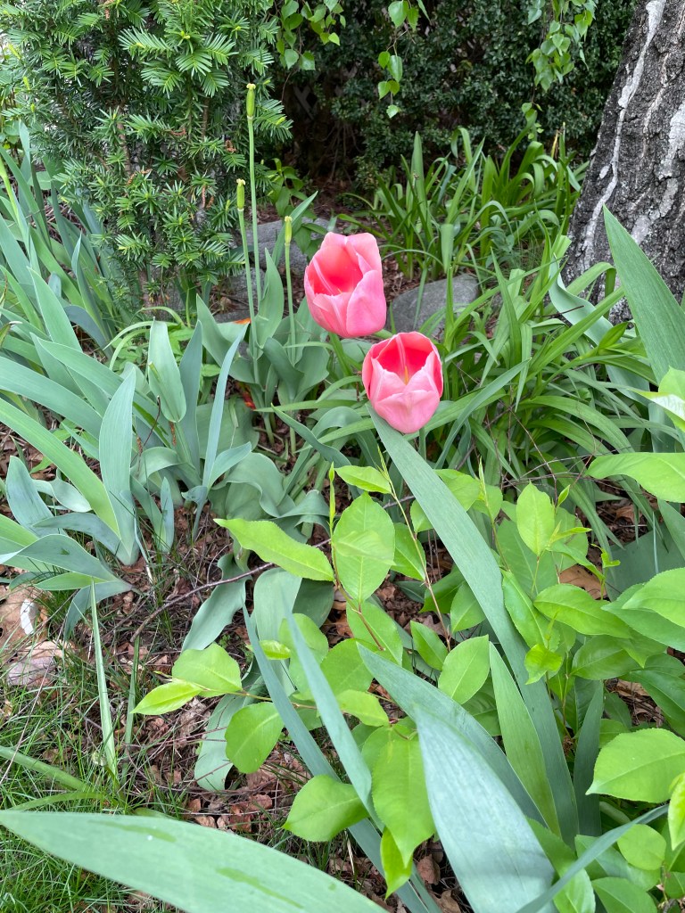 Look!! It’s light out now!! I looked up from the screen, and I can see the street; I can see the weeping birch that curtains my front yard (and the sidewalk) from now until October. I can see the shrubs in front of my porch that cardinals vetted about a month ago for a nest, but rejected. They’re around, so their nest isn’t far. Just not here in front this year. I keep an eye on last year’s robin nest in the crook of one of my downspouts and the eave of the porch. No one has taken it over, but I think some of its structure has been taken for use by others elsewhere, as it looks a bit disarrayed.